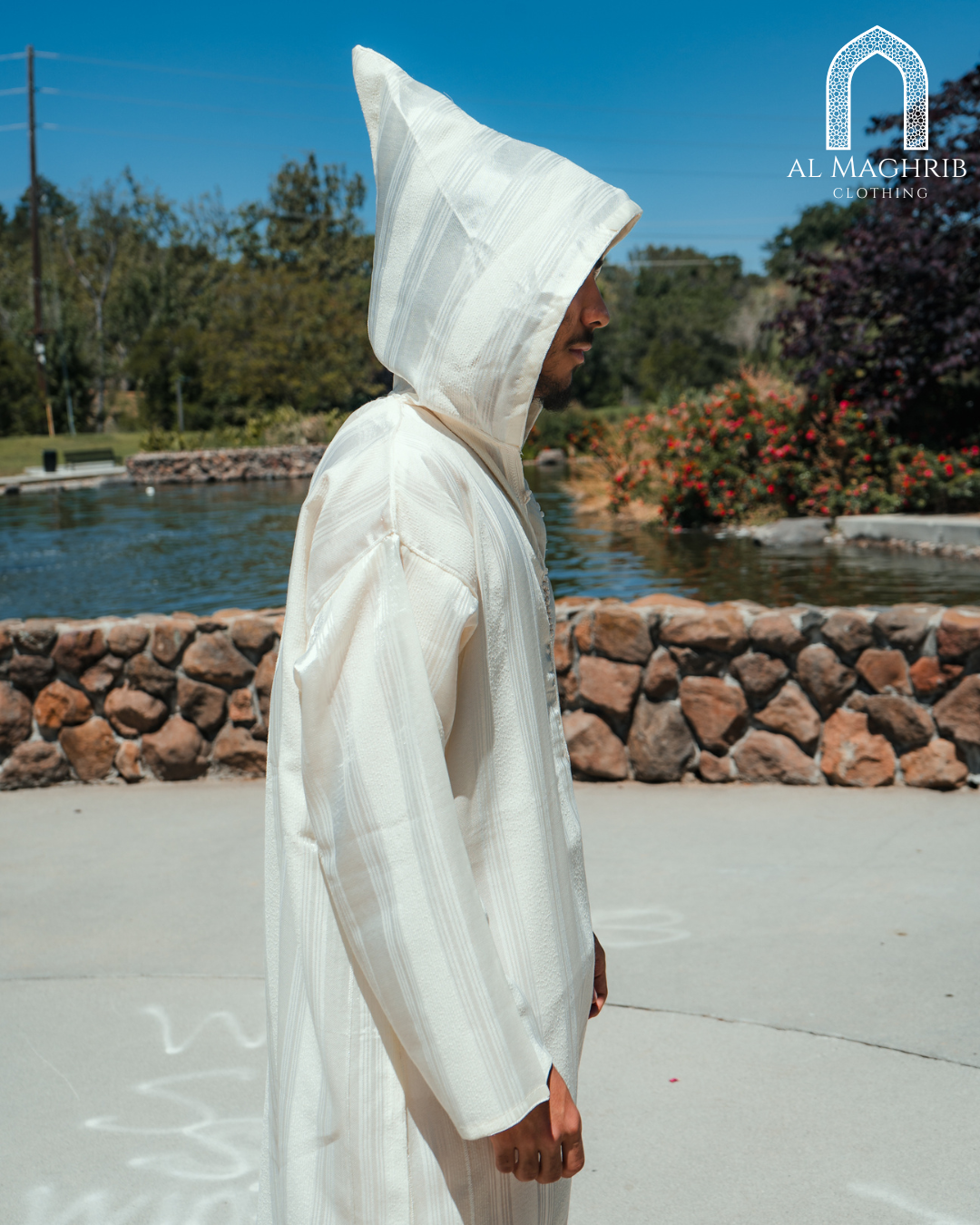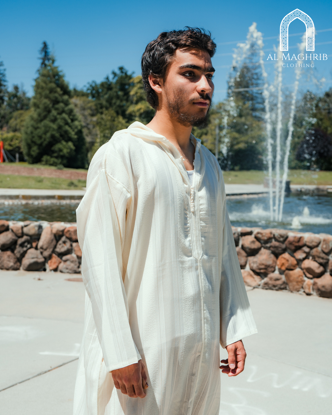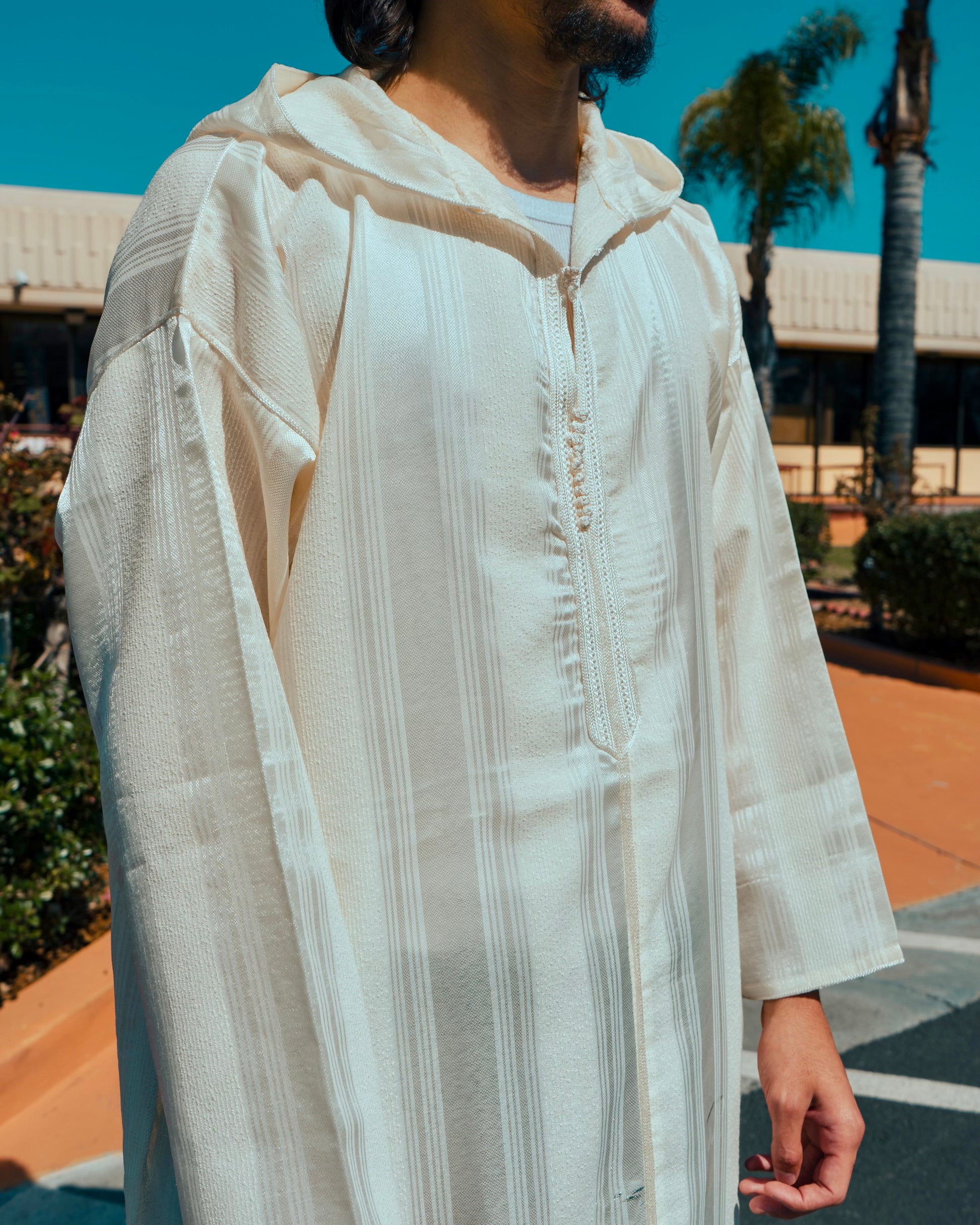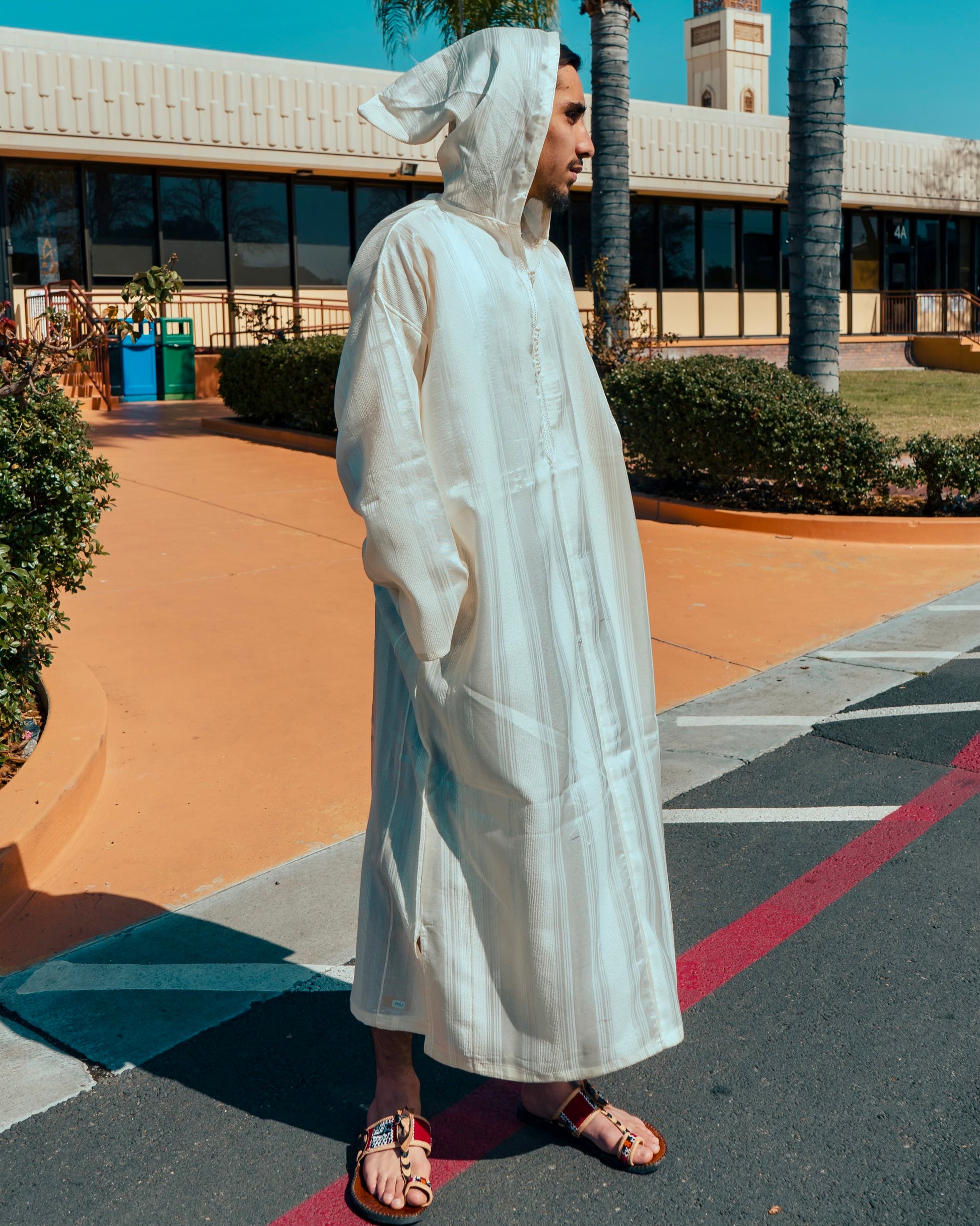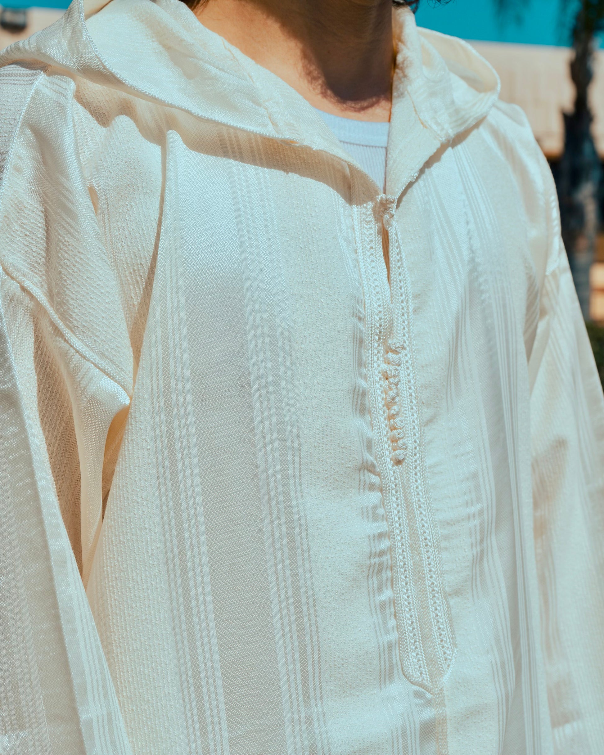 Fit for year-round use, this breathable vanilla white "djellaba" provides its wearer with comfort and modesty.